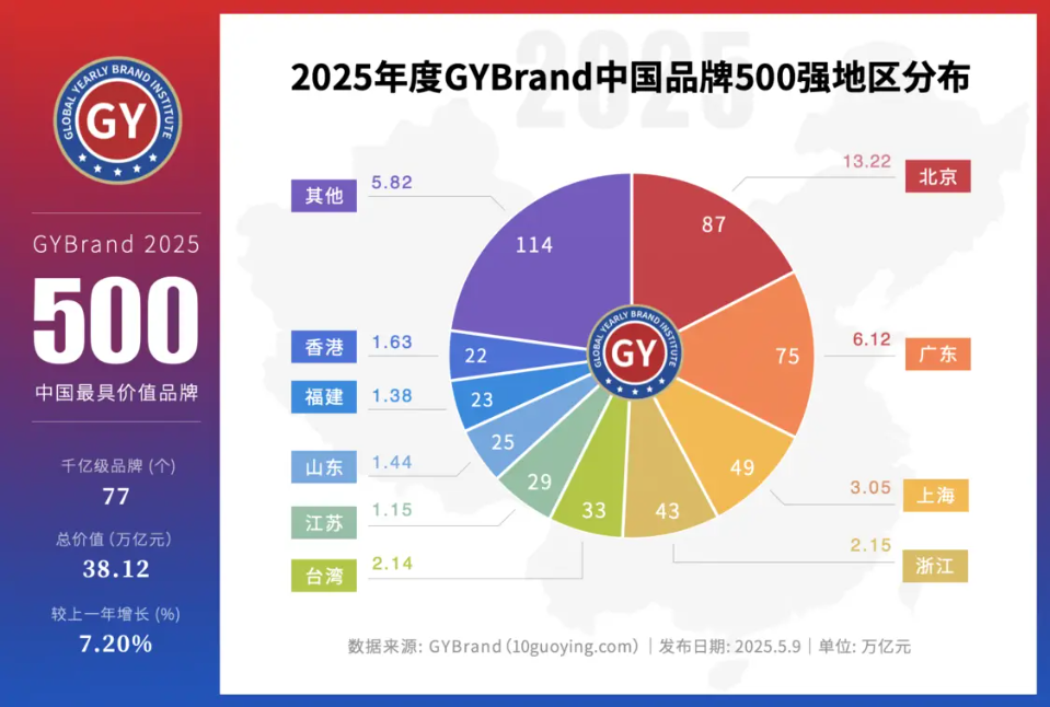 GYBrand近日發布的2025年中國最具價值品牌500榜單顯示(查看報告詳情>>),今年上榜的500個品牌總價值為38.12萬億人民幣,同比增長7.20%,共有77家企業的品牌價值達到千億級別。前十名單中,北京占據6個,廣東占了2個,香港和貴州各占1個,TOP10品牌總價值高達5.47萬億人民幣,占了500強品牌總價值的14.35%。