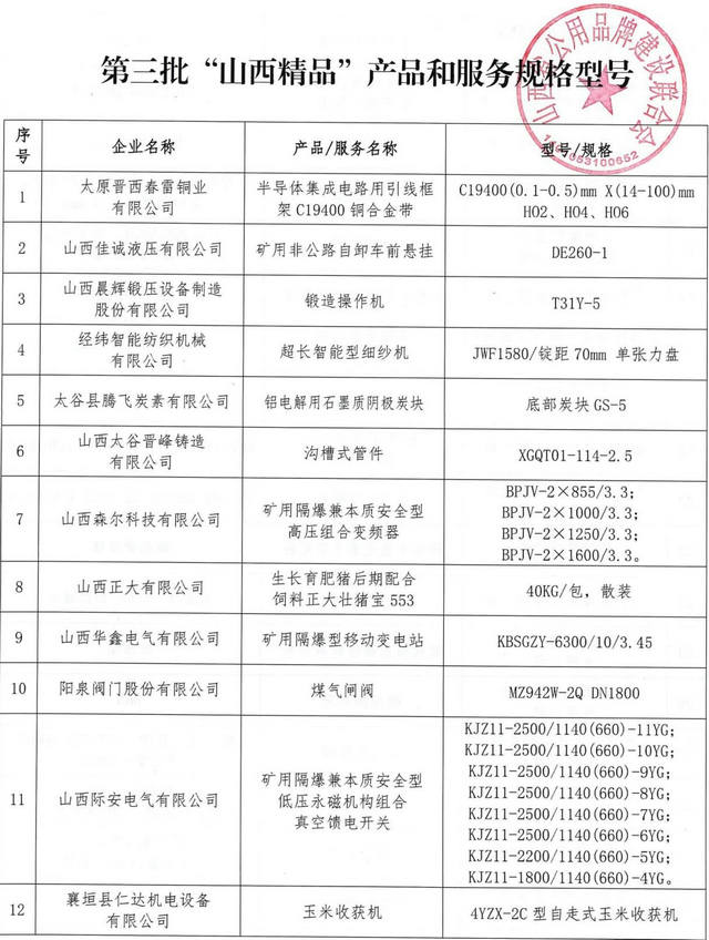 本報訊(記者孟婷)6月27日,記者從山西省公用品牌建設(shè)聯(lián)合會獲悉,經(jīng)過企業(yè)自愿申報、形式審查、標準先進性評價、現(xiàn)場審核、認證/采信、征求意見等嚴格的評定程序,太原晉西春雷銅業(yè)有限公司、經(jīng)緯智能紡織機械有限公司、山西佳誠液壓有限公司、山西正大有限公司、山西麗華大酒店等41家企業(yè)的41個產(chǎn)品和服務(wù)獲評成為2024年度“山西精品”。截至目前,“山西精品”已評選出117家企業(yè)的120個產(chǎn)品和服務(wù)。
