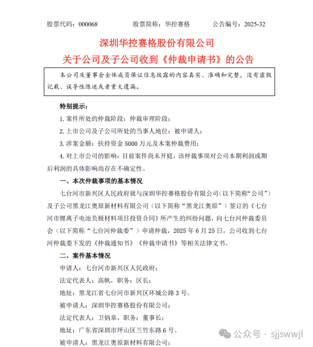 6月25日,華控賽格及子公司黑龍江奧原新材料有限公司收到七臺河仲裁委員會的《仲裁通知書》及相關法律文書,6月27日首次披露仲裁情況,正式宣告案件進入仲裁程序。