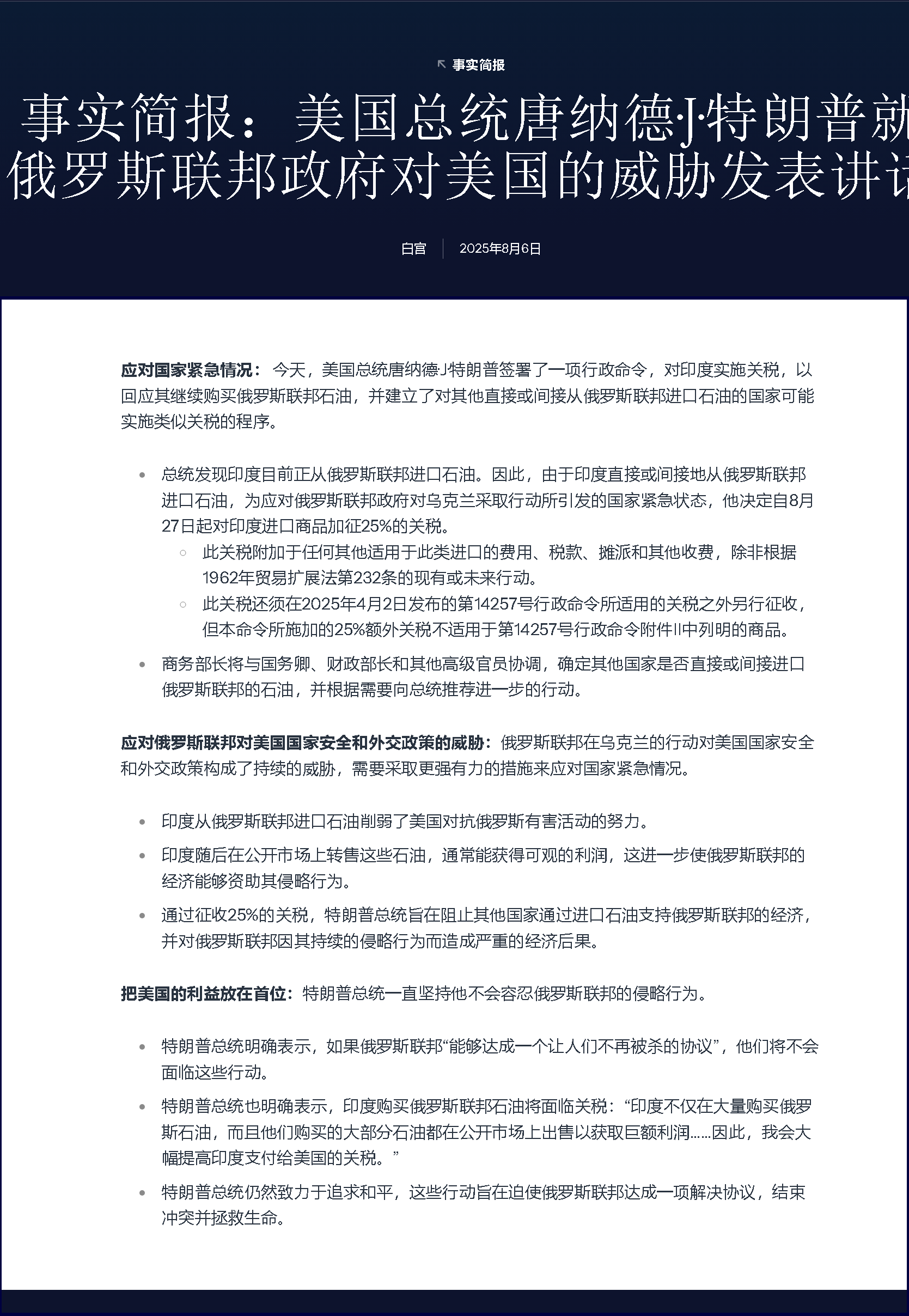 特朗普總統也明確表示,印度購買俄羅斯聯邦石油將面臨關稅:“印度不僅在大量購買俄羅斯石油,而且他們購買的大部分石油都在公開市場上出售以獲取巨額利潤……因此,我會大幅提高印度支付給美國的關稅?!?br />