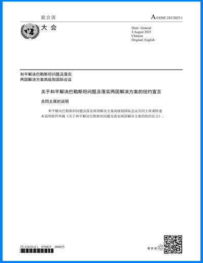 《紐約宣言》是今年7月在聯合國總部召開的有關巴勒斯坦問題國際會議產生的一個成果,該會議由法國和沙特阿拉伯共同主辦,并將于本月下旬繼續舉行。