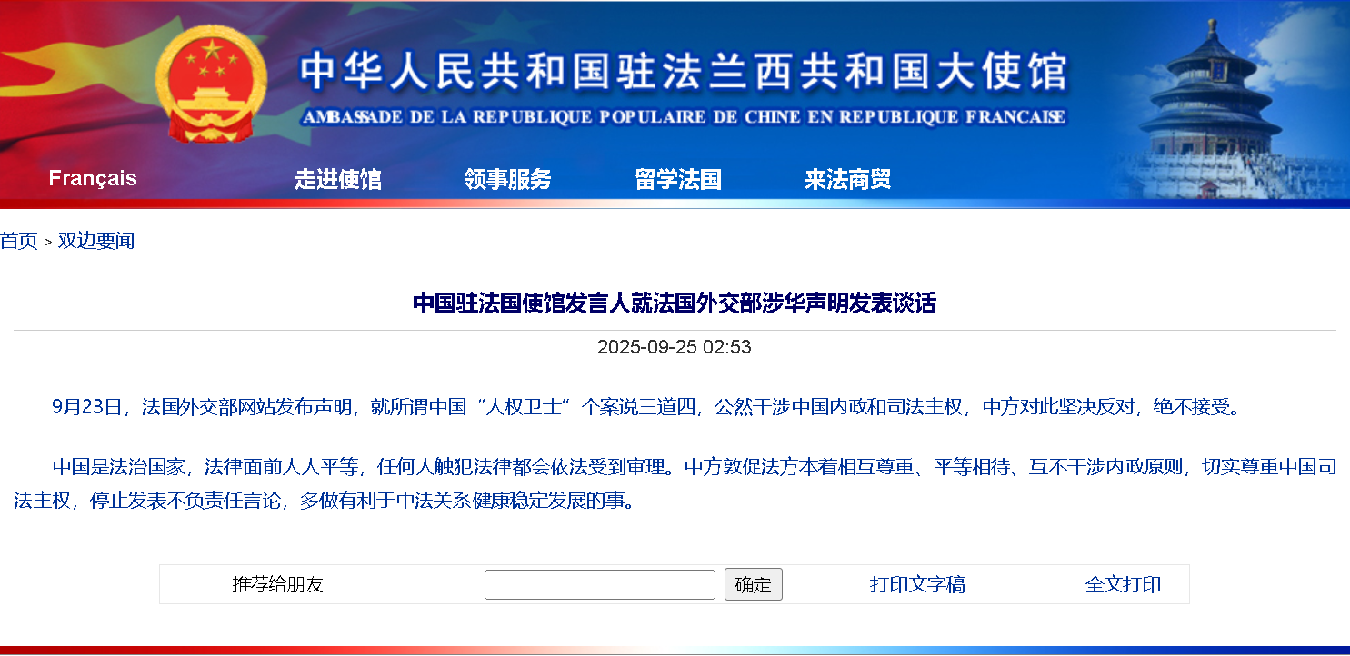 9月25日,中國駐法國使館發言人發表談話,對法國外交部9月23日發布的涉華聲明作出強硬回應。中方用“堅決反對、絕不接受”八個字,徹底劃清了紅線。