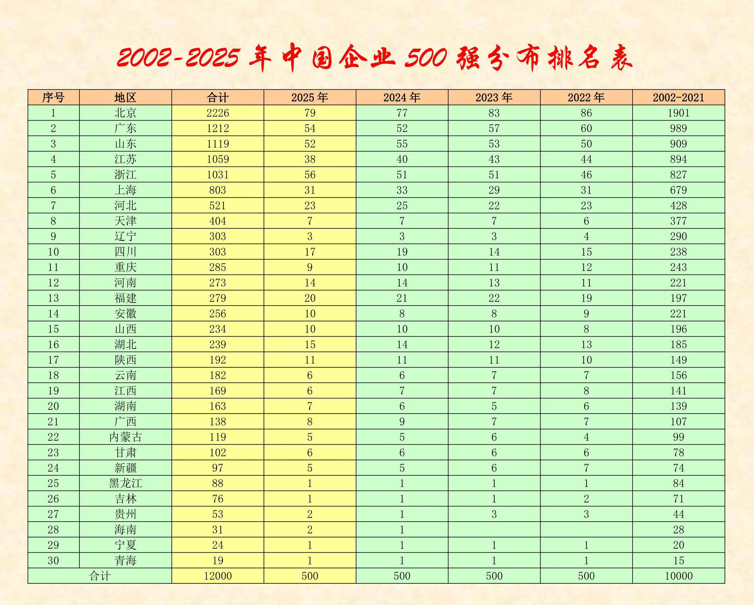 2025中國企業500強共分布在30個省(自治區、直轄市)中,分布最多的五個地區依次是北京、浙江、廣東、山東和江蘇。